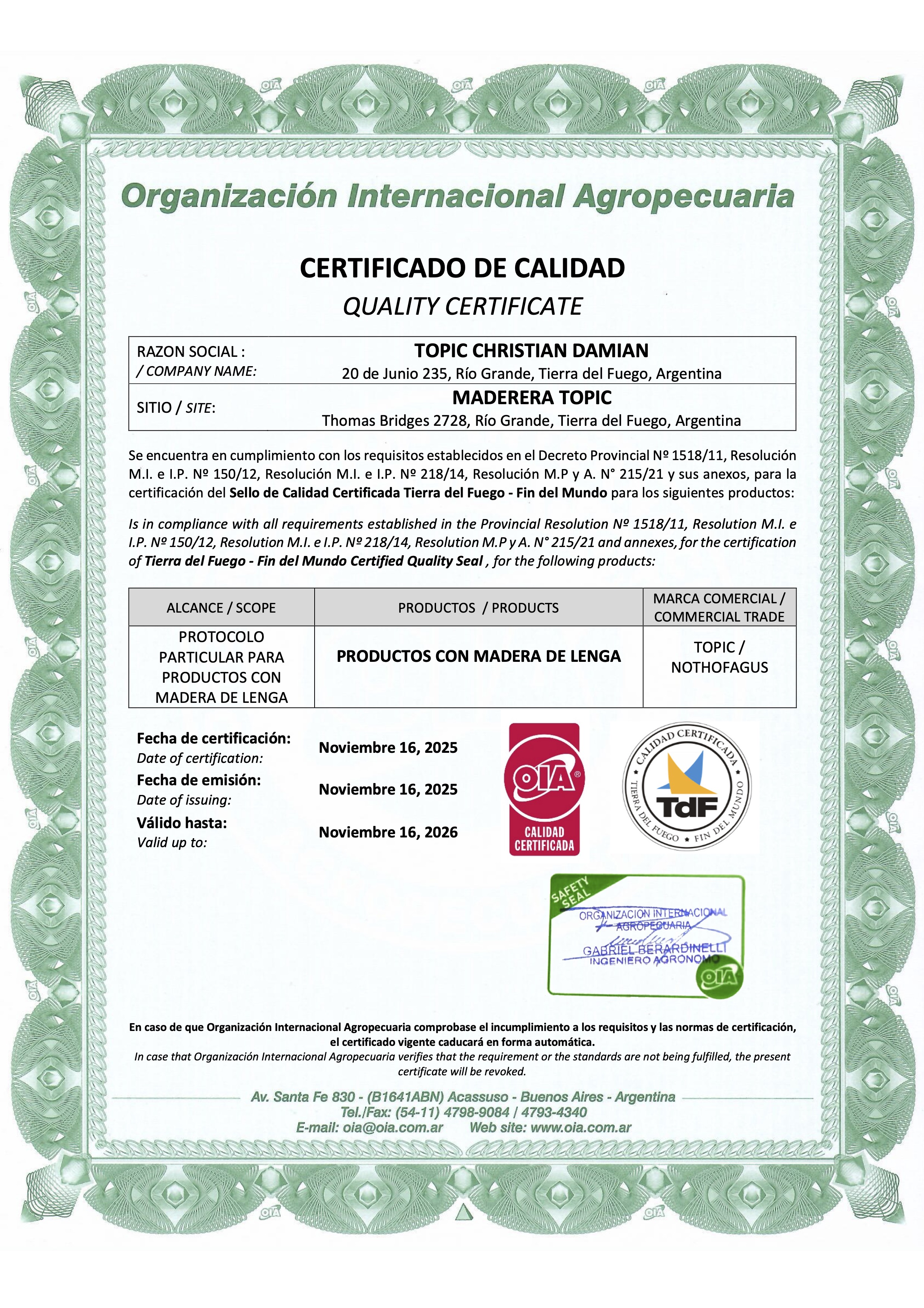 La Organización Internacional Agropecuaria S.A. (OIA), empresa argentina pionera en certificación y altamente reconocida tanto en el ámbito nacional como internacional, es la entidad que respalda nuestros procesos. Sus acreditaciones y avales internacionales permiten que los productos que certifica accedan a los mercados más exigentes del mundo.